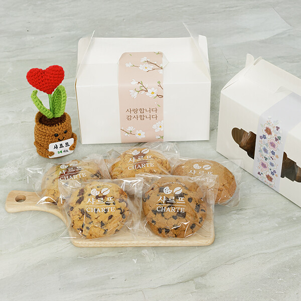 수제쿠키 5개 선물세트는 초코쿠키, 땅콩쿠키, 아몬드쿠키, 크린베리쿠키, 레몬쿠키로 이루어진 세트입니다.